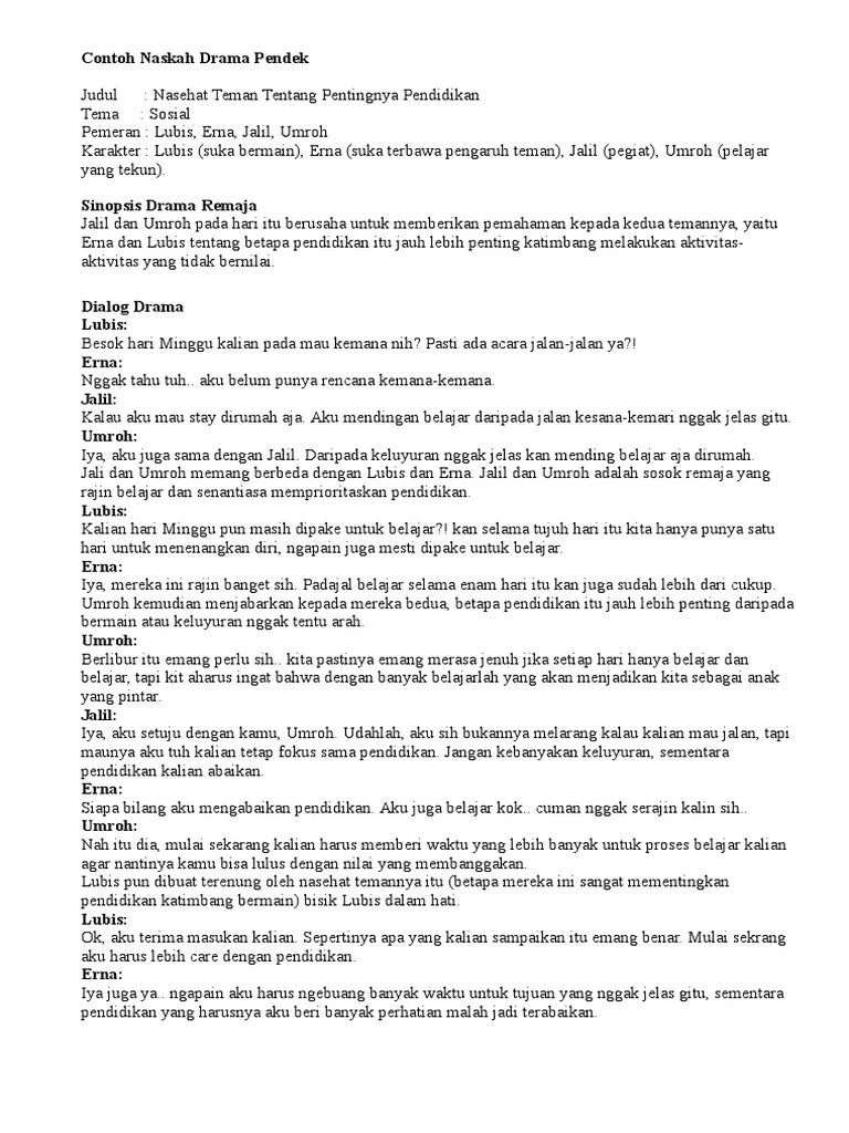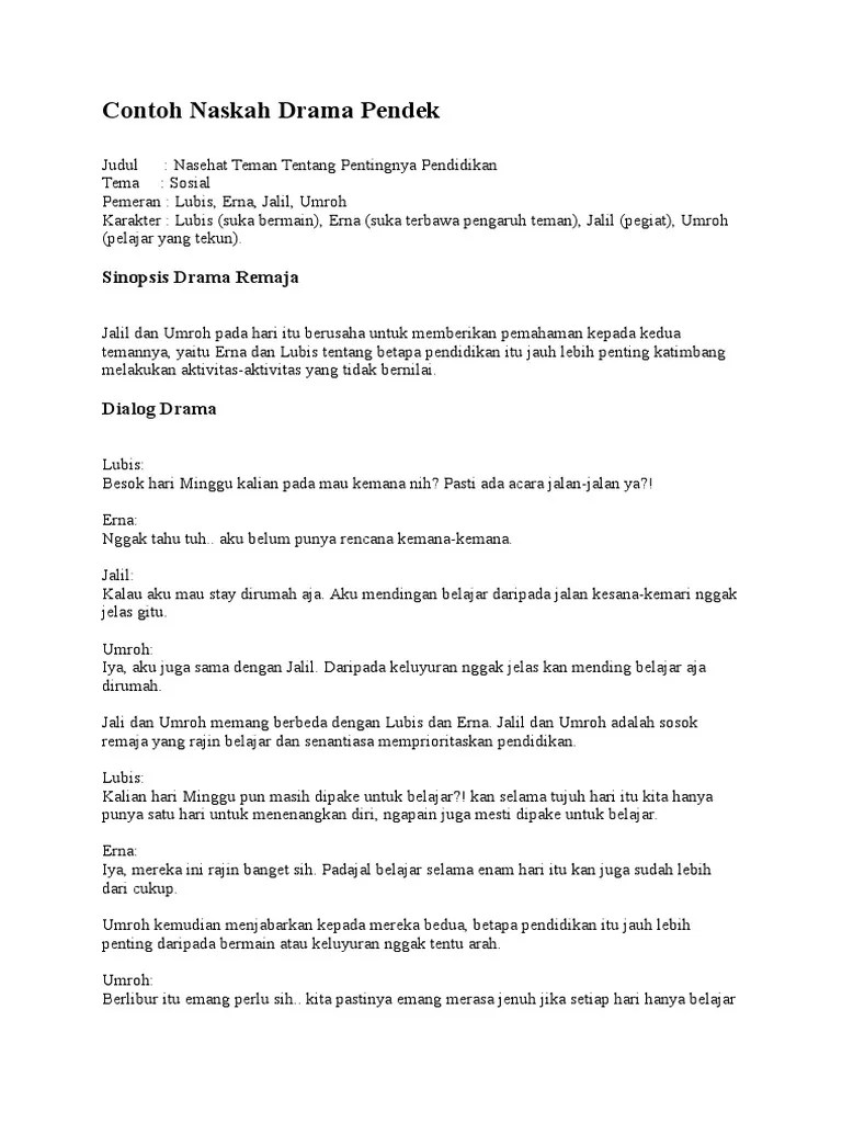 Naskah drama 5 orang tentang pendidikan cute bear drawings, drama, meme,. Posted on 18042017 by the tenan. Naskah drama tema pendidikan judul : Kumpulan naskah drama tema pendidikan . Bagi anda yang membutuhkan naskah drama untuk ditampilkan dalam pentas atau teater, anda bisa download dan instal aplikasi ini. Namun dari sekian banyak drama korea yang mengangkat tema tersebut, . Unsur hiburan dalam naskah drama radio. Contoh teks monolog dalam naskah drama. Berikut ini adalah sebuah contoh naskah drama tentang pendidikan dengan pemeran 4 orang yang bisa menjadi referensi untuk membuat naskah drama . Bagian ini akan mengungkapkan perhitungan frekuensi, . Contoh teks naskah drama singkat tentang pendidikan karakter untuk 8 orang lengkap dengan sinopsisnya. Ucapan narator dilatarbelakangi oleh musik tema. Berikut cuplikan drama bertema pendidikan, yaitu: